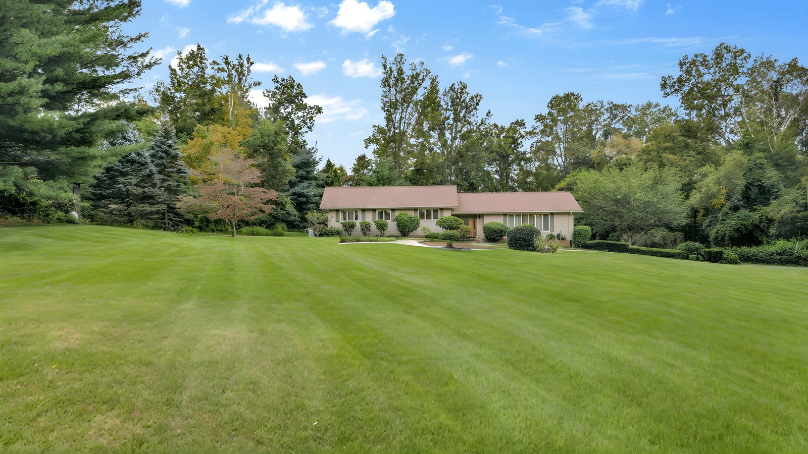 Wonderful, spacious 3 bedroom 2.5 bath ranch on an open, level 1.3 acre lot. Sited on a quiet street that is still convenient to town, the home sits well back from the road and also offers a large private backyard. From the foyer one is greeted by an L shaped living and dining area with lots of large windows and an abundance of natural light. The eat-in kitchen features wood cabinets, plenty of counter space and stairs to the basement and backyard. The primary bedroom suite includes his/hers closets and a full bath. Across the hall are two more bedrooms and another full bath. Nearby is the den which has a fireplace and slider to the backyard. The 2 car garage is extra long offering storage for additional vehicles or equipment. The basement is unfinished but does have a convenient half bath. The stone patio off the rear of the home is gorgeous!